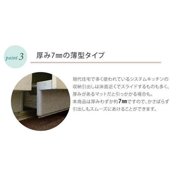 シンプルな無地のキッチンマットです。あえて厚さを薄め(約7mm)にすることにより、システムキッチンでも引っかかりにくい仕様にしています。裏面には滑りにくい加工を施しています。ご家庭の洗濯機で洗えます(ネット使用)ので、清潔にご使用頂けます。