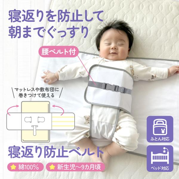 睡眠中の赤ちゃんの寝返りを防止して、朝までぐっすり眠れるベルトです。お布団やマットレスに巻きつけたベルトと赤ちゃんをくっつけることで、赤ちゃんの寝返りを制限します。寝返りで起きちゃう赤ちゃんや、うつ伏せが心配なご両親におすすめです。