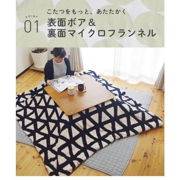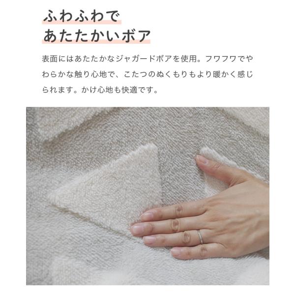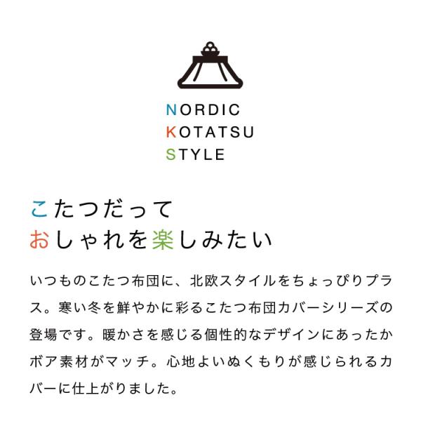 暖かさを感じる個性的な北欧風デザインにあったかボア素材がマッチ。心地よいぬくもりが感じられるこたつ布団カバー