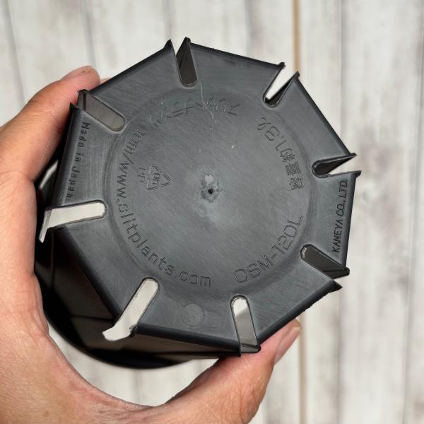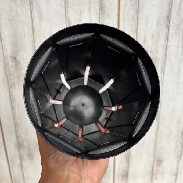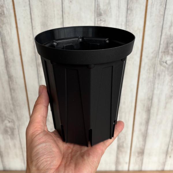 根のサークリングを抑えるスリット構造と、スタイリッシュなブラックカラーで、機能性とデザイン性を兼ね備えたプラ鉢です。