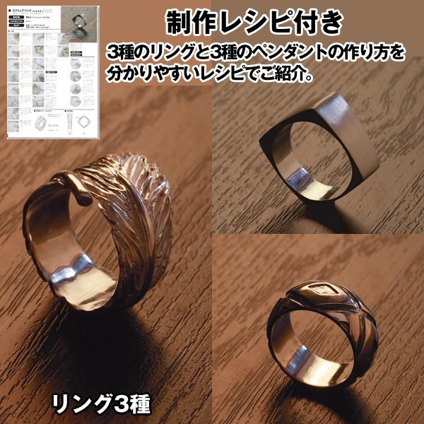 粘土状の純銀素材「銀粘土アートクレイシルバー650」10gと木芯棒、ヤスリ、各種研磨用具など制作に必要なツール、ガスコンロ焼成やリングの制作マニュアルが ワンセットになっている、どなたでもすぐに純銀製のオリジナルアクセサリーを作ることができるキットです。