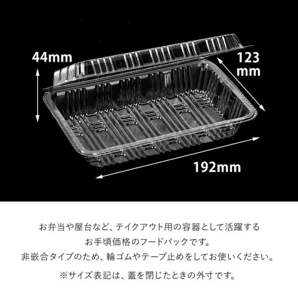 安価なフードパック。非嵌合タイプのため、輪ゴムやテープ止め、超音波溶着が必要です。※サイズ表記は、蓋を閉じたときの外寸です。