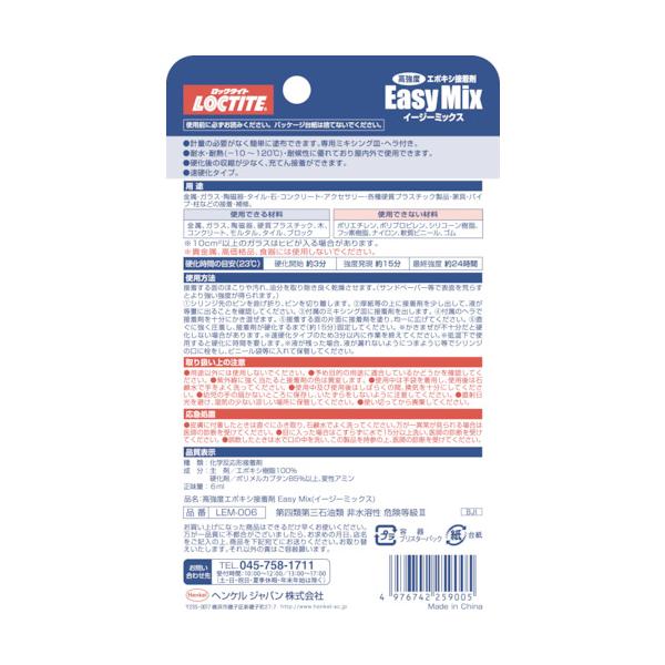 プロキュアエース ★★★★★ 4.5(5,383件) ヘンケルジャパン(株) LOCTITE 高強度エポキシ接着剤 2液タイプ イージーミックス 透明 6ml ▼374-9401 LEM-006 1S ●色:透明●容量(ml):6●可使時間(23℃):約3分●梱包数(個): 12 プロキュアエース 人気ランキング もっと見る プロキュアエース 商品一覧 もっと見る
