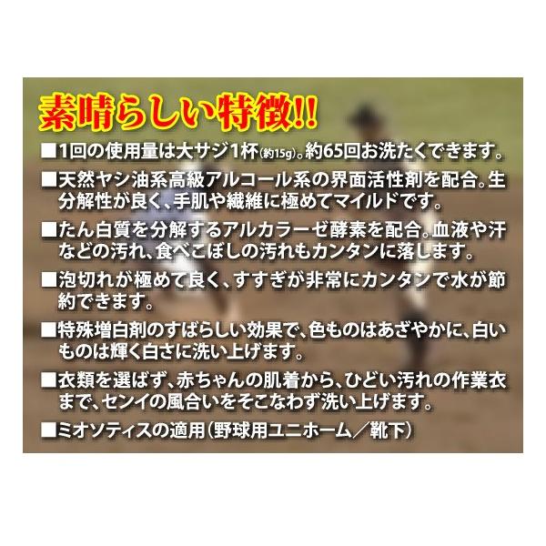 【優良配送】【あすつく】「素晴らしい特徴」1回の使用量は大サジ1杯(約15g)。約65回お洗たくできます。天然ヤシ油系高級アルコール系の界面活性剤を配合。生分解性が良く、手肌や繊維に極めてマイルドです。たん白質を分解するアルカラーゼ酵素を配合。血液や汗などの汚れ、食べこぼしの汚れもカンタンに落します。泡切れが極めて良く、すすぎが非常にカンタンで水が節約できます。特殊増白剤のすばらしい効果で、色ものはあざやかに、白いものは輝く白さに洗い上げます。衣類を選ばず、赤ちゃんの肌着から、ひどい汚れの作業衣まで、センイの風合いをそこなわず洗い上げます。ミオソティスの適用(野球用ユニホーム/靴下)