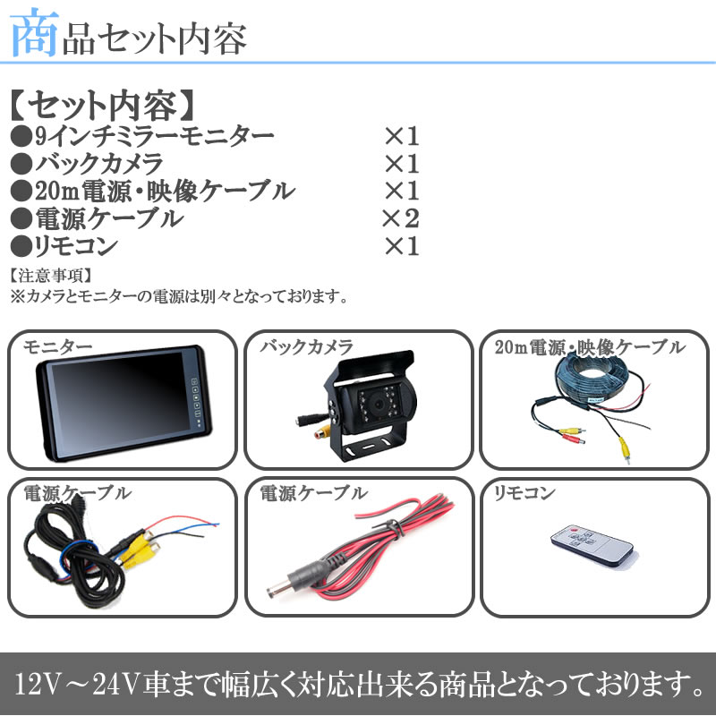バックカメラ + ミラーモニター 9インチ 液晶モニター 赤外線 LED搭載/暗視機能付 12V/24V 省エネ ノイズ防止 トヨタ いすゞ 日野 FUSO UD TRUCKS マツダ