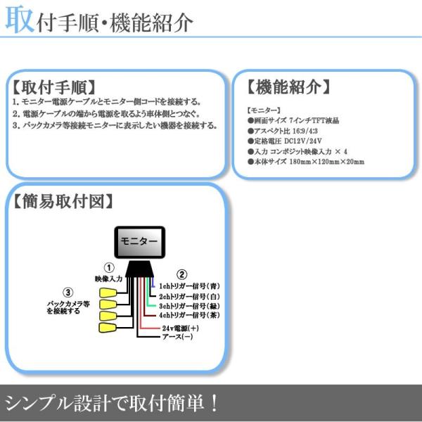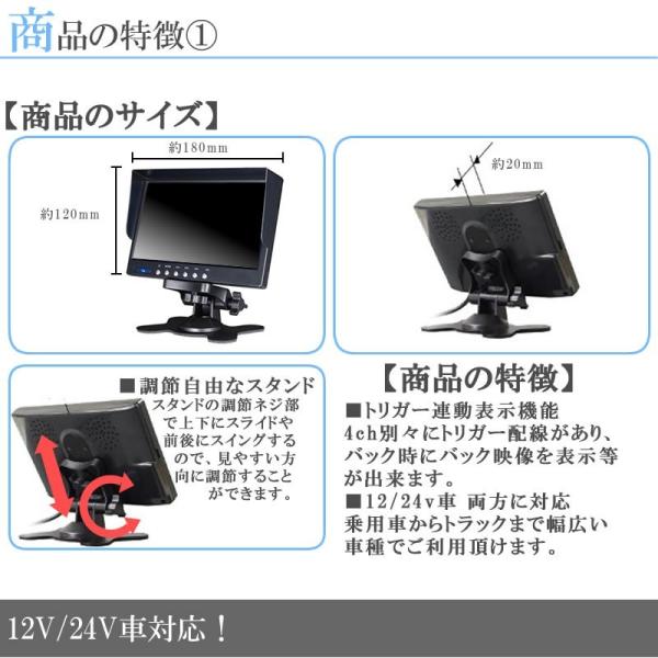 7インチ オンダッシュ 液晶モニター 12V 24V対応 4分割 ノイズ防止4ピンケーブル