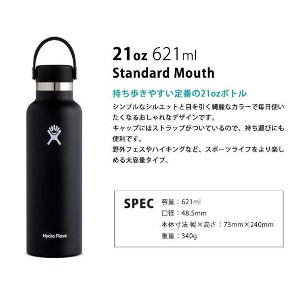■商品情報:Hydro Flask(ハイドロフラスク)のユニセックス(男女兼用)なアウトドアグッズ「 HYDRATION スタンダードマウス【21oz】 (621ml)(21 oz Standard Mouth) 」は携帯に便利なステンレスボトル(水筒、タンブラー、ドリンクボトル、魔法瓶、マグボトル)です。2026年春夏(26SS)新色。サイズは21オンス(621ml)の大容量タイプ。十分な水分補給を行えるサイズ。ストラップ(取っ手)付き。500ml以上