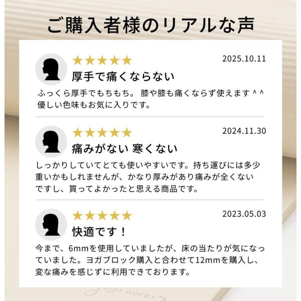 〇底付きしないので腹筋、背筋などのフロアストレッチ、また座位や横になるポーズが中心のヨガにも最適