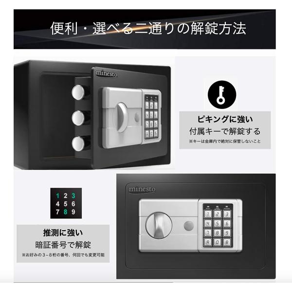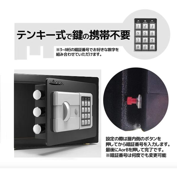 【らくらく設定】金庫の開錠は暗証番号を入力してハンドルノブを回すだけの簡単解錠!暗証番号は3〜8桁で自由に何度でも再設定が可能!電池が切れてしまった場合は、付属の鍵を使って解除できるので、もしもの時も安心です。