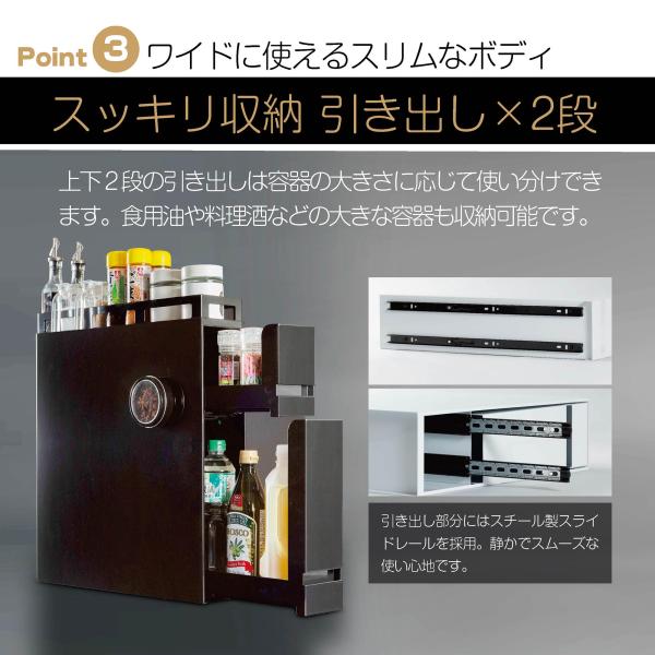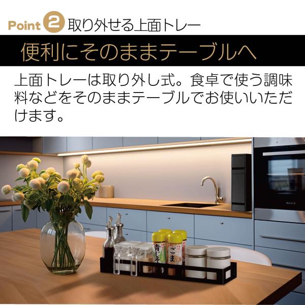・隠せる引き出し収納と上段棚の2つの収納で、生活感を隠しながらコンロ周りを整理整頓できます。