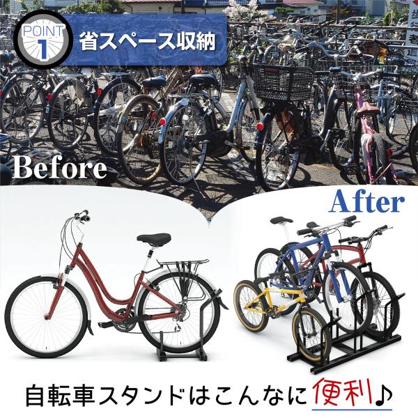 【自転車の整理整頓に最適】無造作に自転車をとめてしまうと、前輪があちこちに傾いてバランスを崩したり、倒れたり、一台ごとの駐輪スペースの場所をとってしまうことがあります。自転車スタンドの使用によりこのような状況を防ぎます。