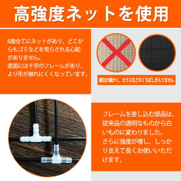 個別ゴミ出しによるカラスや野良猫からのゴミ荒らしをしっかりと防ぎます。高強度なネット、細かい網目でカラスのくちばしを通しません。