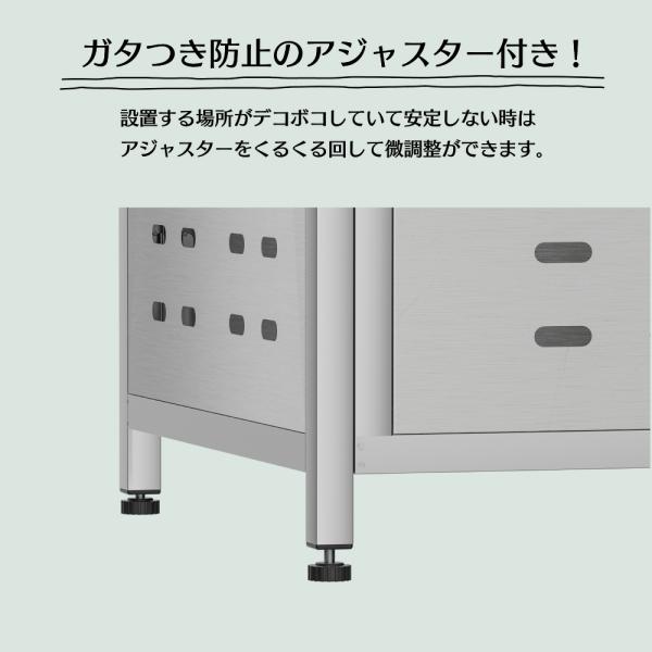 ・脚は充分な高さがあり、地面から離れているので水たまりなどの影響も受けません。 また、高さ調整ができるアジャスターがついていて、ガタつきがある設置場所でも安定して設置ができます。