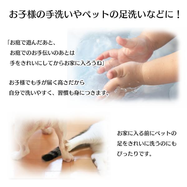 子供が庭で遊んだ後、靴洗い、洗車、ペットの散歩後、畑仕事後の汚れた手をさっと洗えて便利。