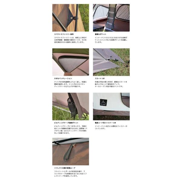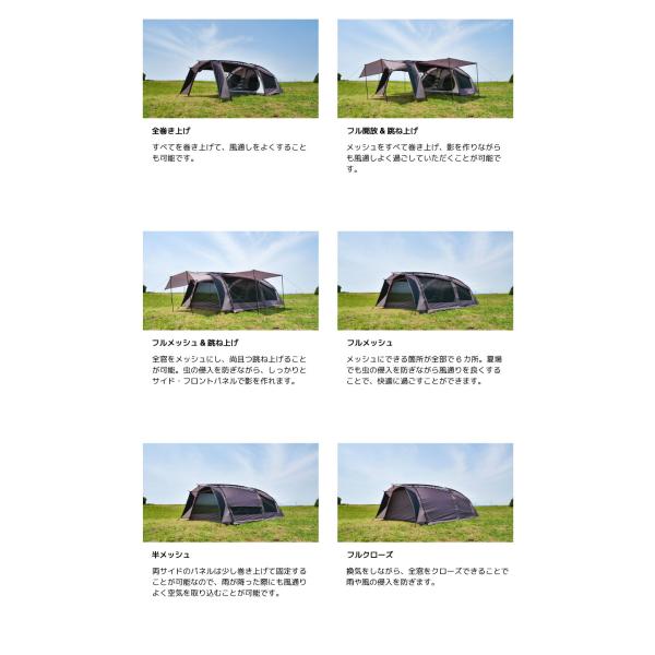 ドーム型のメリットである、居住空間の最大化に加え、後方から前方にかけて張り出しを作ることで、別でタープを用意する必要が無く、リビングスペースを設けることが可能に。また、跳ね上げをすれば幅5m以上の前室を作ることも可能
