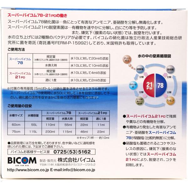 スーパーバイコム78とスーパーバイコム21PDがセットになった、誰もが簡単に窒素循環を水槽内に作ることができるキットです。