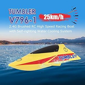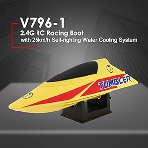 Specifications: Model name: V796-1 Color: yellow/White optional Frequency: 2.4GHz Motor: brushed motor Servo: 9g waterproof servo Charger: USB cable Battery for boat: 7.4V 360mAh Li-ion battery (included) Battery for transmitter: 4 x 1.5V AA battery (not included) Running speed: Max to 25km/h Operation distance: About 100 meters Charging time: About 60-90mins Playing time: About 10mins Function: go forward, turn left and right, self-righting Battery size: 44 x 26 x 14mm Item size: 260 x100 x 85mm Item weight: 184g (battery excluded) Notice: Carefully read the instruction before any use, if you are a beginner, it's advisable to be assisted by an experienced adult. Package Information: Package size: 379x 279 x 94mm / 14.9 x 10.98 x 3.7in Package weight: 770g / 1.7lb Package List: 1 x RC Boat 1 x 2.4GHz Transmitter 1 x 7.4V 360mAh Li-on Battery 1 x Spare Propeller 1 x Boat Holder 1 x Tool Set 1 x USB Cable 1 x English Manual