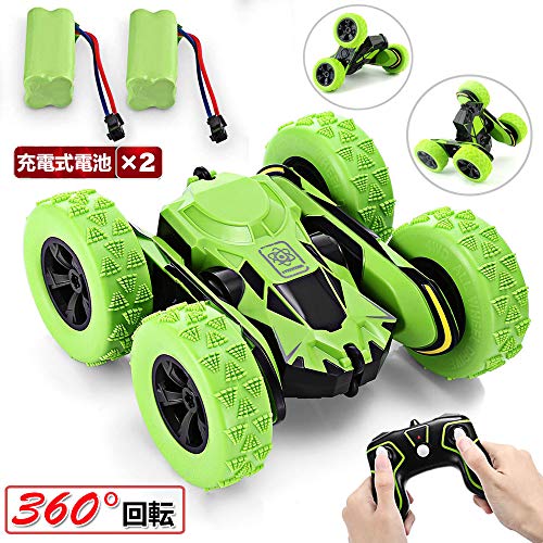 Aning 771 view リモコンカー 電動ラジコンカー スタントカー 360度回転 ジャンプ 2.4GHz無線 両面走行特技を持つ USB充電式 高速 四輪駆動 耐衝撃 車おもちゃ 操作簡単 子供 小学生 贈り物 (グリーン