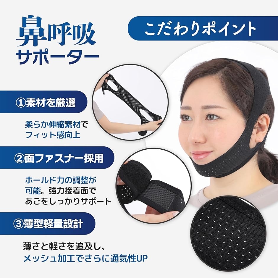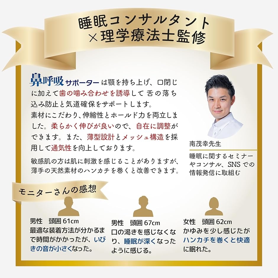 「睡眠コンサルタント監修」ナイロンとポリウレタンを採用してフィット感とホールド力を両立したいびき対策グッズです。