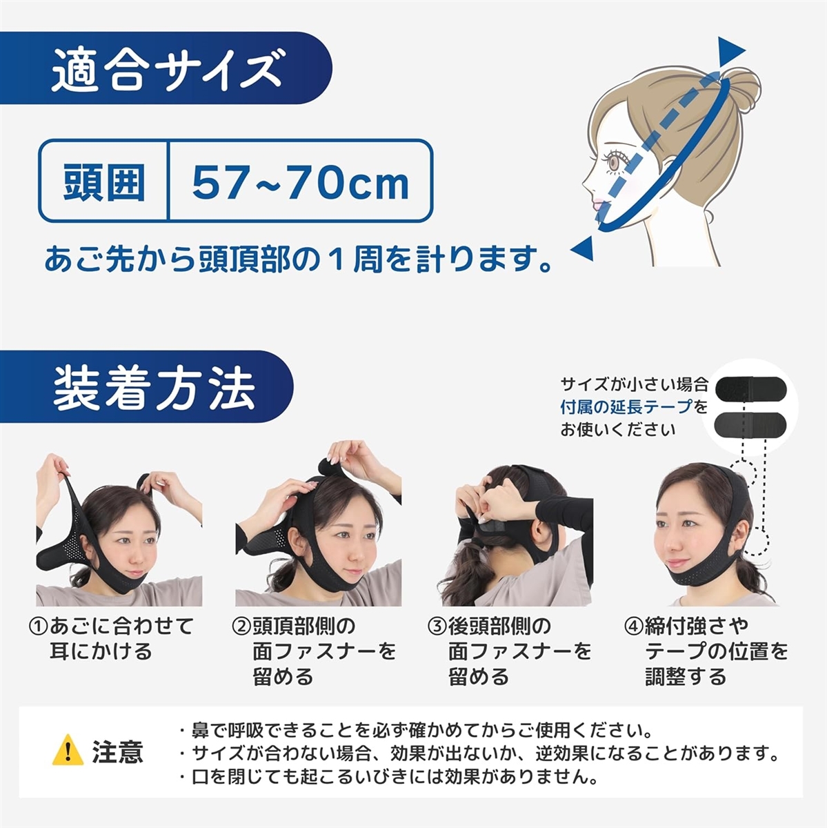 顎バンドの適合サイズは頭囲57〜70cmです。