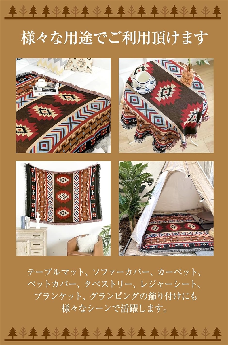 ラグとして使用して頂くだけでなく、ソファーカバーやグランピング、ピクニック等のレジャーシートしても活躍し、幅広いシーンでご利用いただけるオールシーズン使える厚手のラグマットです。
