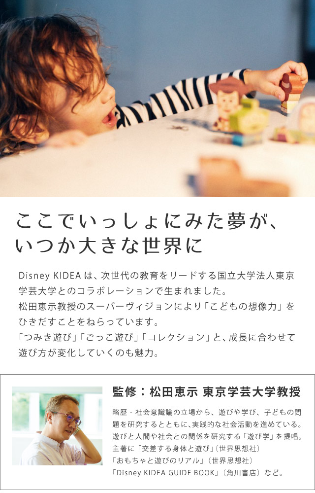 ディズニーの原体験がこどもの手のひらサイズの遊びの中で魔法のように再現されるだけでなく、成長にあわせた遊び方の変化を促すことも特徴です。