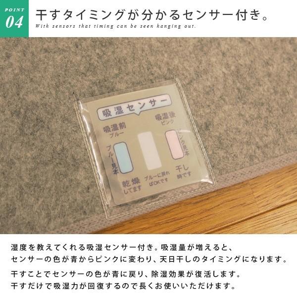敷き布団・マットレスのカビ対策にオススメの除湿シート。敷き布団・マットレス・敷きパッドの下に敷くだけで湿気をドンドン吸収してくれますので、結露対策・押入れにも◎。備長炭入りで消臭力アップ!加齢臭のもとになる「アンモニア・酢酸・イソ吉草酸」も消臭!干し時が分かるセンサー付き、乾燥させて何度でも使えます。さらに洗濯機で丸洗いできるので、いつも清潔です。