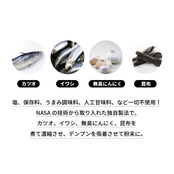 素材をまるごとペプチド状に!いつものお料理にサッと一振りで手軽においしいだしがつくれます。塩分、添加物一切不使用の無添加自然食品です。真空、圧力、ろ過の自然現象を基にした独自の方法で製造し、素材の味を壊さず天然素材本来の旨みがいっぱい詰まっています。原料は国産のイワシ、カツオ、昆布、無臭ニンニクをまるごと使用しております。イワシやカツオは頭から骨、内臓、目玉まで全て使用し、化学処理を一切加えずにアミノ酸を低分子状態のペプチドにしました。お味噌汁やお鍋のだしや、和、洋、中問わずにご使用いただけます。時間のない時でもお湯に溶かすだけで美味しい栄養スープにもなります。アレルギー27品目や食塩、酵母エキス等の添加物は一切不使用の為、お子様の離乳食からお年寄りの方のお食事のサポートまで幅広くご利用頂けます。美容や健康を気にしている方にもオススメです。 【内容量】100g(10g×10包) 【原材料】カツオ、イワシ、無臭ニンニク、コンブ、デンプン(キャッサバ由来) 【生産国】日本