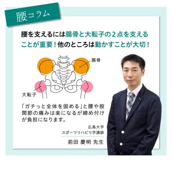 広島大学共同開発。締めるところは締め、解放するところは解放する二つのベルトが合わさった骨盤ベルト。上部ベルトで骨盤(腸骨)を左右から締めることで、骨盤自体のズレを防ぎ、腰痛の予防にもなります。下部ベルトで横から締め付けるのではなく、大転子を斜め下から包み込むように支えることで、サポートしながら股関節(大転子)が柔軟に動きます。締め付けが苦手な方に最適です。また、背面には、3本のボーンで仙骨を支えてあげることで、骨盤の前傾を促し負担のない姿勢に導きます。歩行効率が上がるので、ぐんぐん歩く事ができ、負担の少ない体になる事で、日常生活を良くしていく事ができます。 【サイズ】S-Mサイズ:ヒップ82〜95cm、L-LLサイズ:ヒップ92〜105cm 【カラー】ブラック 【材質】ナイロン80%、ポリウレタン20%