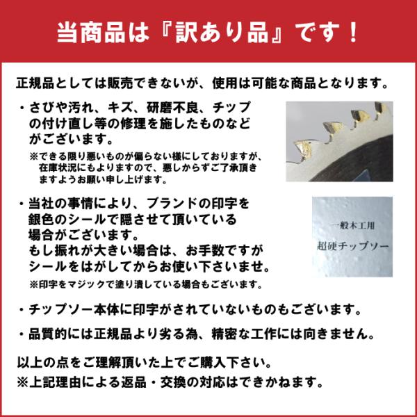 さびや汚れ、キズ、研磨不良、チップの付け直し等修理を施したもの、チップソー本体に印字がないもの、印字をマジックで塗り潰したものなどがございます。(返品・交換対象とはなりませんのでご了承下さい。)