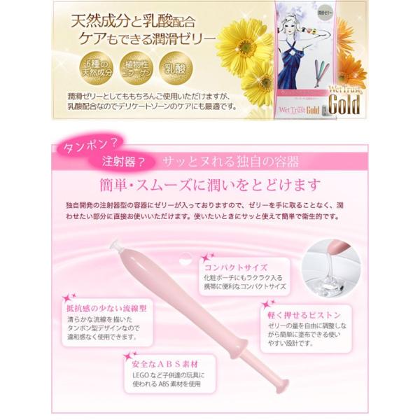 産婦人科医と当社が共同開発したワンタッチ式の潤滑ゼリー。潤滑ゼリーを手に取ることなく、使いたいところにサッと直接使えるので、簡単かつ衛生的にご使用いただけます。ローション成分に、植物性コラーゲン・アロエエキス・緑茶抽出物・イチョウ葉エキスなどの天然成分と乳酸を加えた、長時間持続タイプのpH4.5のジェルタイプ水溶性潤滑保湿ゼリーです。※チャ葉には成分的に若干味のある成分が含まれています。乳酸配合なので、デリケートゾーンのおりもの・においのケア目的にもご使用いただけます。【商品名】ウエットトラストジャパン ウェットトラストゴールド 30本入り【サイズ】85×100×150mm【質量】308g(1.7g×30本)【使用期限】24ヶ月【成分】水、グリセロール、ブタンジオール、ヒドロキシエチルセルロース、乳酸ナトリウム、ヒドロキシ安息香酸メチル、アロエベラ液汁、フェノキシエタノール、PEG-14M、乳酸、プロピルパラベン、ダイズ発酵エキス、エチレンジアミン四酢酸二ナトリウム、チャ葉エキス、ヤマグワ根皮エキス、イチョウ葉エキス、カミツレ花エキス【広告文責】株式会社ルーマニア/03-5876-8031