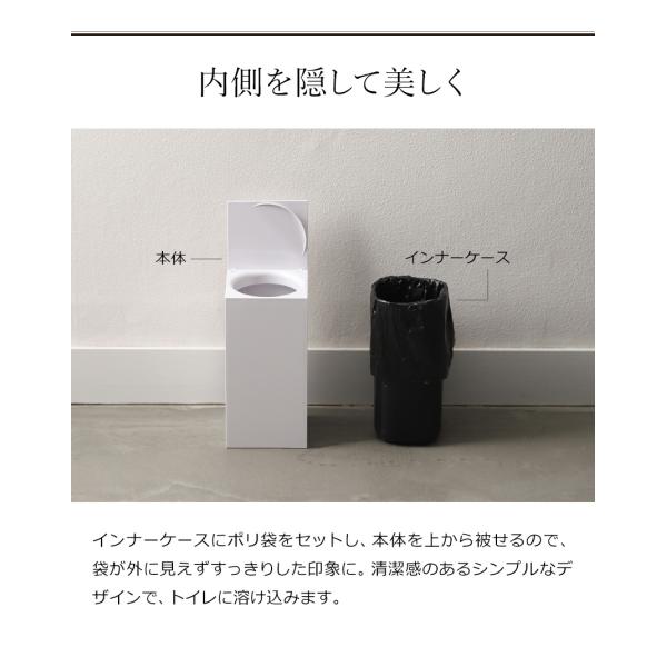 角型フォルムでトイレの隅にフィットする『 RETTO( レットー )コーナーポット 』は、シンプルで洗練されたサニタリーボックス。インナーケースにポリ袋をセットして本体を上から被せる二重構造で、袋を隠してすっきりした印象に。フタの角に浮き上がるような滑らかなカーブがあり、指をかけて開けやすいのも◎。空間になじみやすい清潔感のあるモノトーンのトイレポットです。