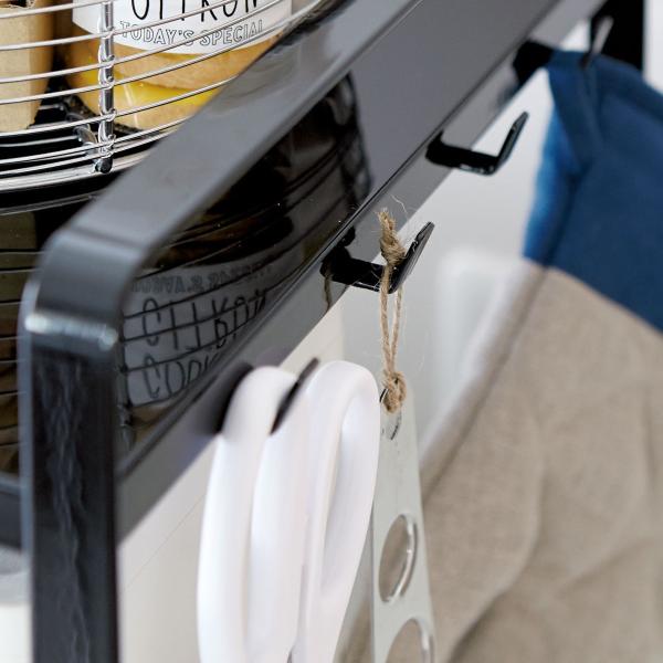 電子レンジ上のスペースを活用できる『 tower( タワー )伸縮レンジラック 』。幅が約47.5〜75cmまで伸縮し、置きたい場所やお使いの電子レンジに合わせて調節できます。棚下の高さは約44cmと高めの設計なので、大型レンジなども収納可能。スチール製のしっかりした安定感が頼もしい、便利なアイテムです。