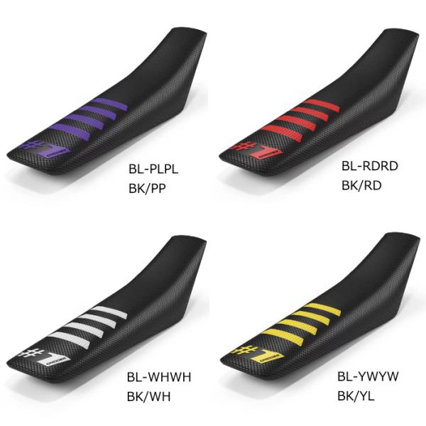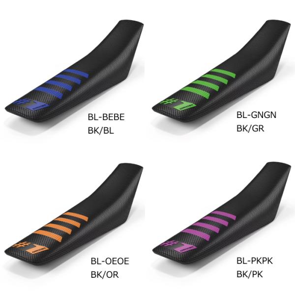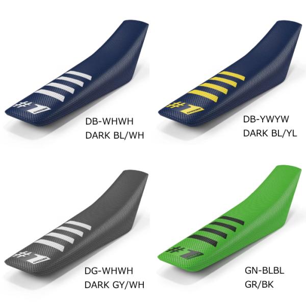 次世代シートカバーONEGRIPPER-RIBBED。 RIBBEDはマディコンディションでのグリップを向上させた人気モデル。シート後方の4段リブはグリップ力を追求し、車体にファクトリーマシンのルックスを付与。