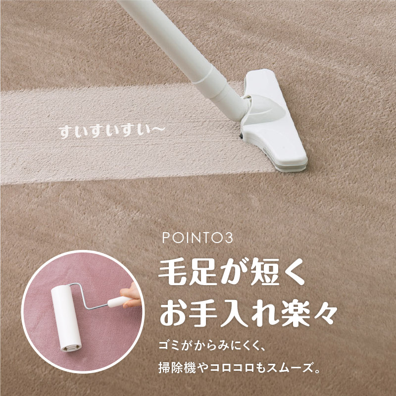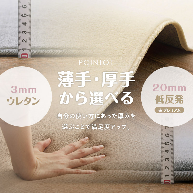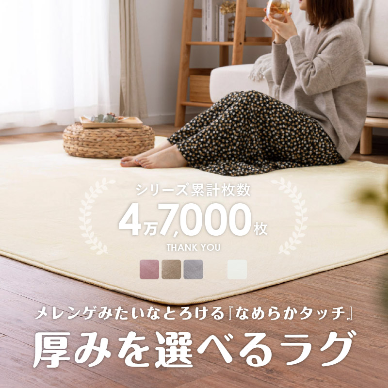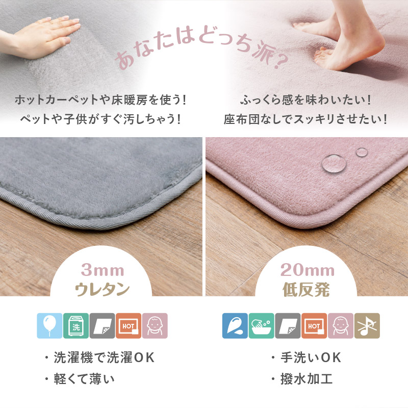 地が見えないほどの毛足密度で思わずな左右になでたくなる肌触りの良いなめらかなタッチ感です。洗濯機でお洗濯が可能で、薄めウレタンと女性でも軽々持てる軽さで取り扱いやすく、日常のお手入れも楽々です。裏には不織布にドット滑り止め付きで、フローリングでも滑りにくく、リビングや子供部屋にもおすすめです。