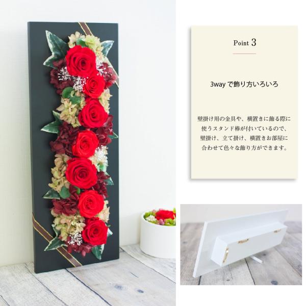 フレームにプリザーブドフラワーのローズ、アジサイ、カスミソウなどを贅沢に詰め込みました。ホワイトのフレームは、ピンク系とグリーン系で可愛らしい仕上がりに、ブラックのフレームはレッド系とパープル系でモダンでカッコ良く仕上げました。※一部造花の葉を使用しています。新築祝いや開店・開業祝い、誕生日、結婚祝い、結婚記念日、敬老の日、母の日などの記念日の贈り物に大変喜ばれています。