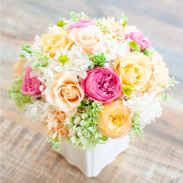 可愛く、優しい色合いの360度どこから見ても美しいオールラウンドのプリザーブドフラワーアレンジメントをデザインしました。プリザーブドフラワーには様々な種類のお花がありますが、最も華やかで人気があるのは「花の女王」と言われる薔薇。品格や気品がある姿は他の花を圧倒しています。色や形の異なる薔薇を贅沢に使用し、造花やリボン、イミテーションを一切使用せずに全てプリザーブドフラワーでアレンジいたしました。