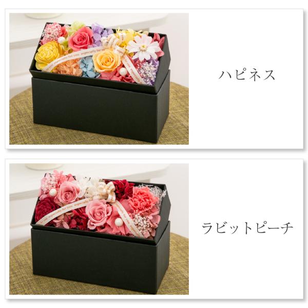 プリザーブドフラワー : ローズ、アジサイ、カスミソウ、ジニア(ハピネスのみ)、カーネーション(ラビットビーチ・キャロットオレンジ・フレッシュピンクのみ)、小菊(レモンイエロー・ロイヤルパープルのみ)