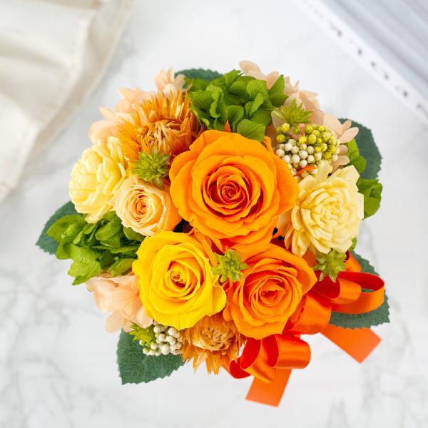 色鮮やかなプリザーブドフラワーを贅沢に使用した、まあるく愛らしい定番アレンジ