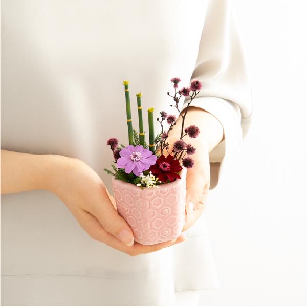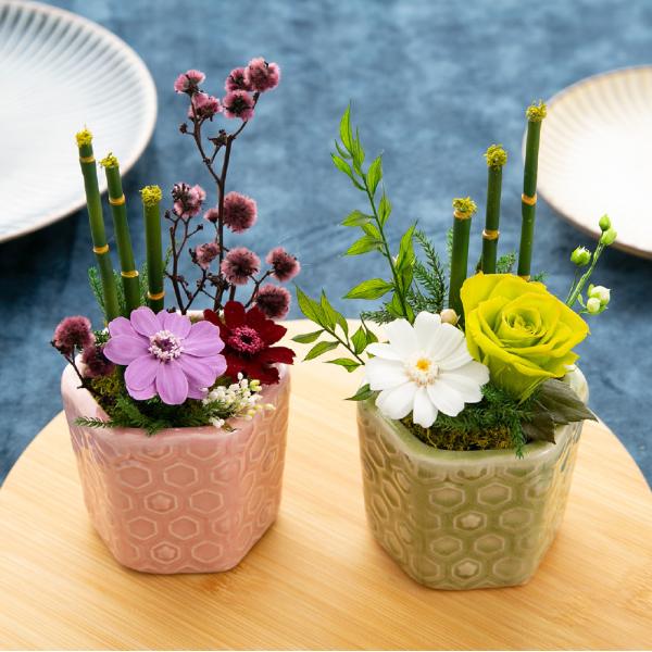 こちらのアレンジは和の心を感じながら自然の美しさやプリザーブドフラワーの麗しさをお楽しみいただけます。