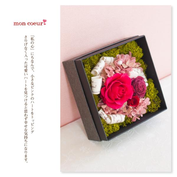 フタを開けると目に飛び込んでくるローズ&ハート『mon coeur』とはフランス語で『私の心』という意味。大切な方の誕生日・新築祝い・結婚祝い・出産祝い・クリスマス・退職祝い・敬老の日・母の日等に、プリザーブドフラワーの中でも人気のBOXフラワーで、『私の心』を込めた贈り物をしてみてはいかがですか?