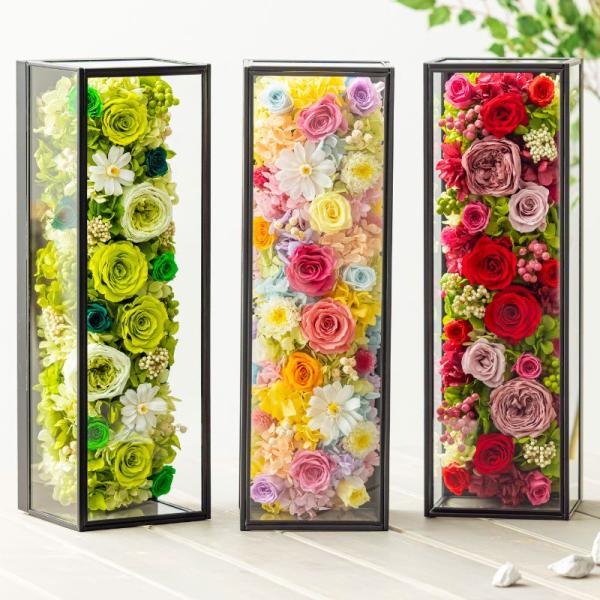 ガラスケースに入っているので明るく鮮やかで綺麗な色合いを長期間お楽しみいただけます。