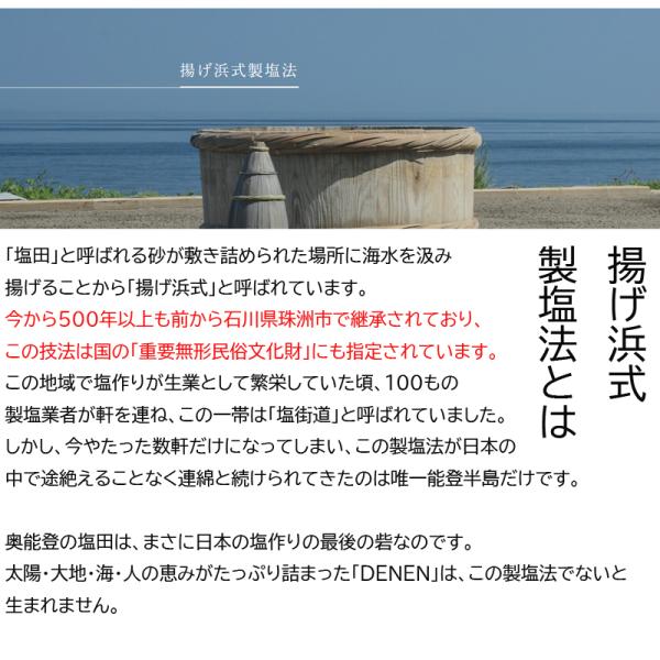 塩 塩分 しお シオ おすすめ塩 海塩 海水を使った塩 海 海の栄養 能登 石川県 奥能登 日本海の塩 日本海 珠洲市 伝統 揚げ浜式製塩法 海水塩 ミネナル 栄養 能登半島 アンテ 製塩法 海水 世界農業遺産 里山 綺麗な海 denen 天然塩 揚げ浜式 塩田 天然塩 調味料 塩分 しおおにぎり塩漬け 漬物 唐揚げ ソルト 安全 日本 500年 天日塩