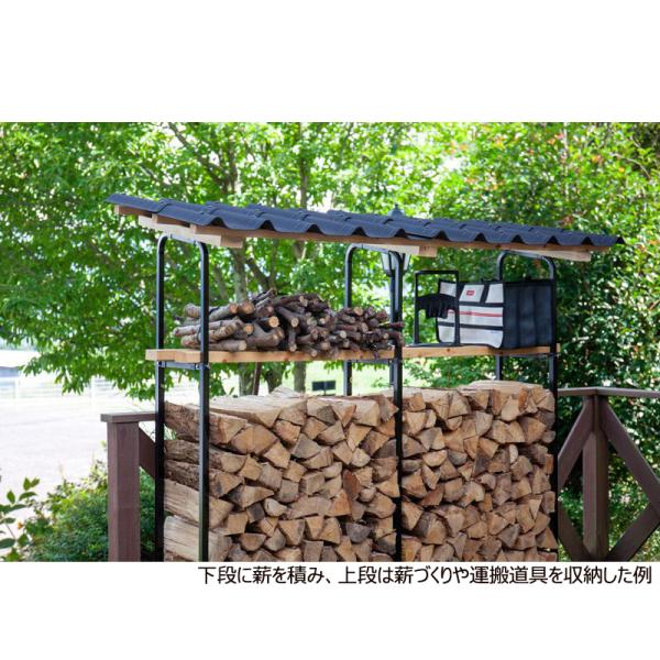 例として下段に薪を積み、上段は薪づくりや運搬道具を収納して管理します。