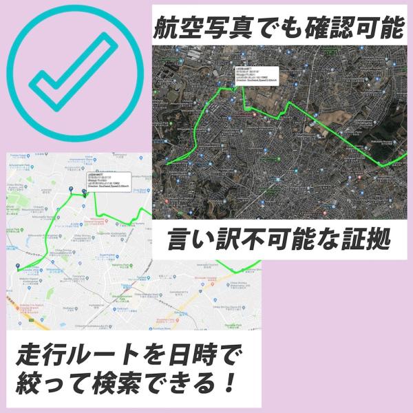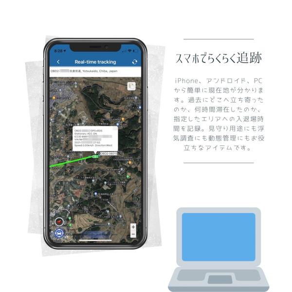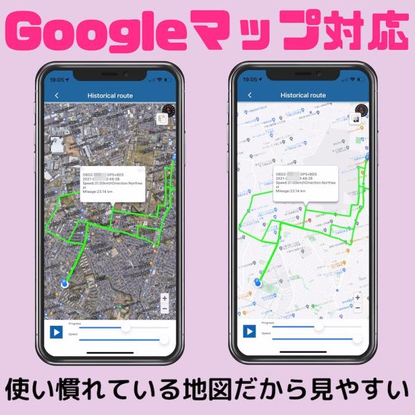 リアルタイム追跡と指定した日時の足取り(軌跡)をスマホのアプリで簡単に把握できます。