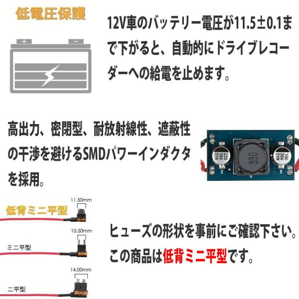 車内の常時電源と接続する場合、更に車バッテリーあがりの防止ができます。このケーブルは電圧が11.5±0.1Vまで下がるを検知する時、ドラレコの運作を止めます。