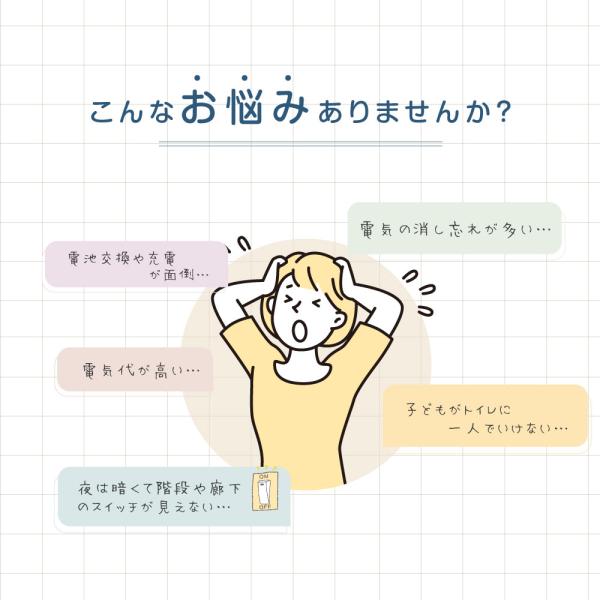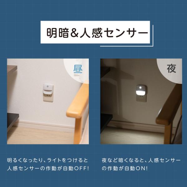 【高感度センサー】人が近づくと作動点灯ON:センサーライトの設置しているコンセントの周囲120°のエリア、かつ0~6mの範囲内に人の動きを感知したときにライトがONになります。この範囲外では、人感センサーライトがOFFの状態となっています。周囲が暗くなると作動待機ON:明るくなったり、ライトをつけると人感センサーの作動が自動OFF!夜など暗くなると、人感センサーの作動が自動ON!