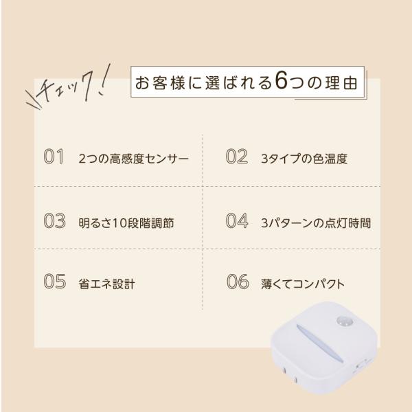 【製品仕様】本体サイズ:約W6.5×D2.4×H7cm / カラー:ホワイト/ 色温度:2900?3200K(電球色) 、4500K(白色) 、5500?6000K(昼白色) / 重量:約40g / 調光:10段階 / センサー感知角度:120°