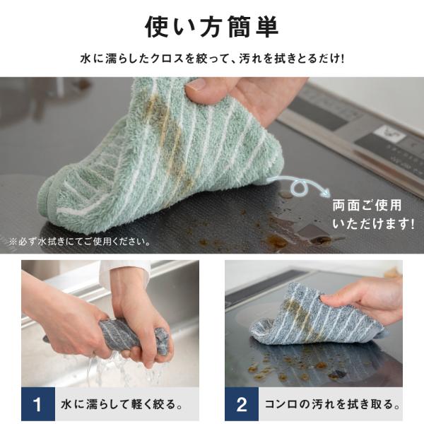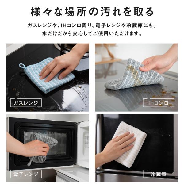 【油汚れ・水垢落とし/水拭きでOK】マイクロファイバーは細かなホコリや油膜などの汚れを吸着しやすいのも魅力です。コンロ周りのしつこい油汚れも水拭きだけでピカピカにします。蛇口やシンクの水垢、ヌメリも落として艶やかに拭き上げます。