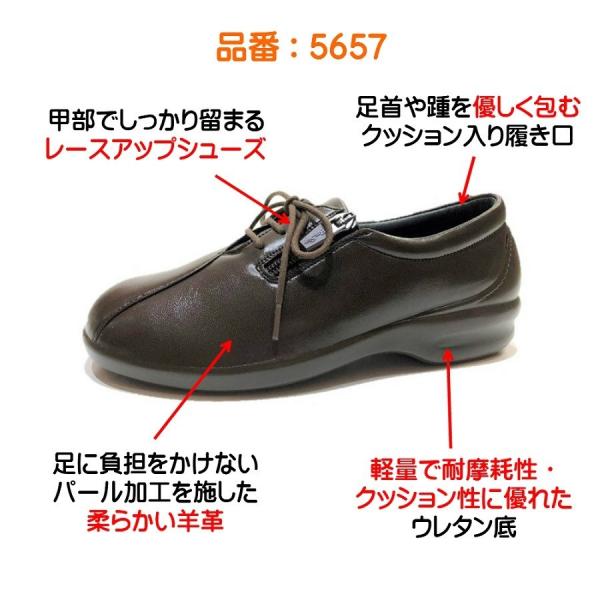 こちらの品番5657は幅広4Eタイプで人気のコンフォートウォーキングシューズ。幅広4Eなのに華奢に見える見た目とボンステップ特有の安心の履き心地が人気の理由です。